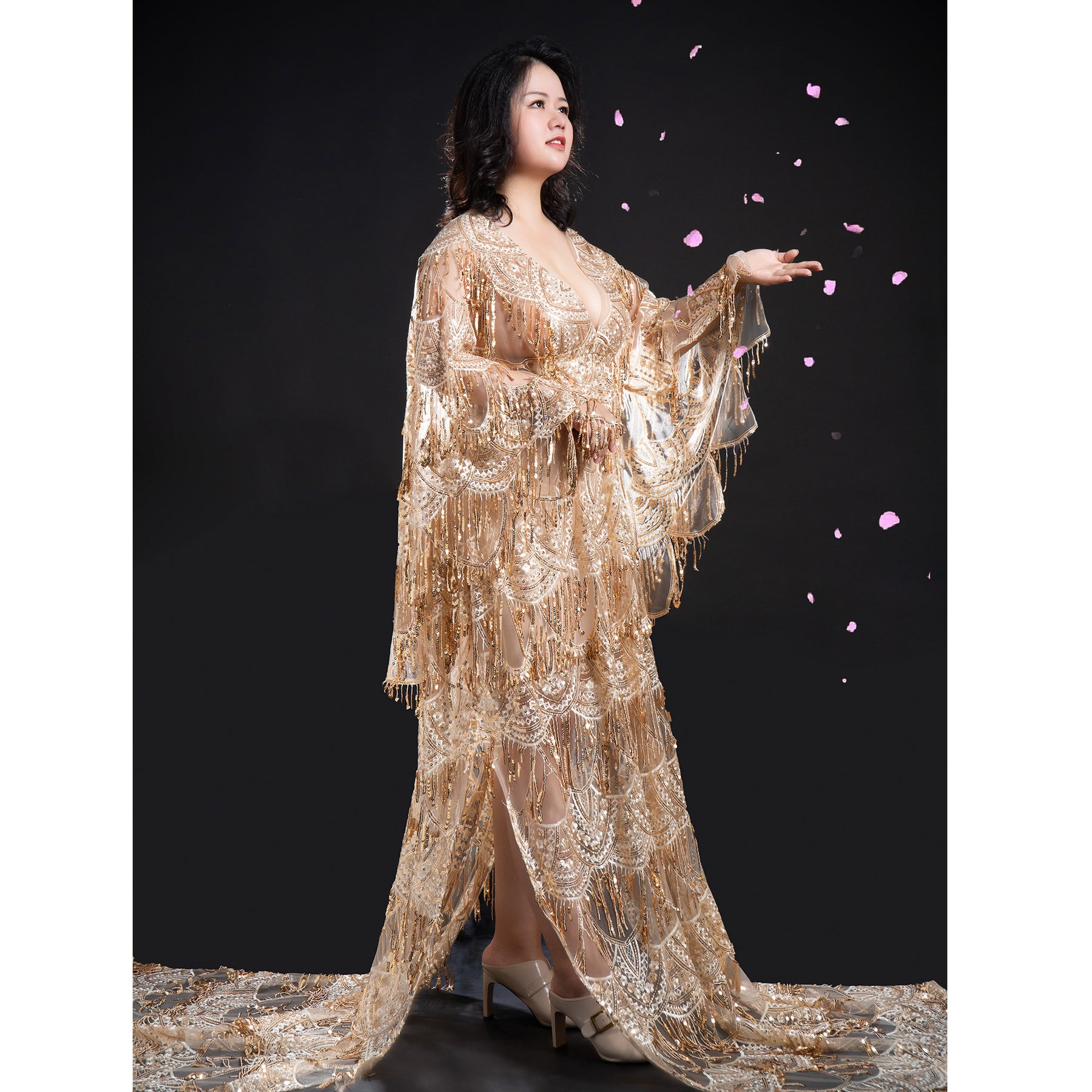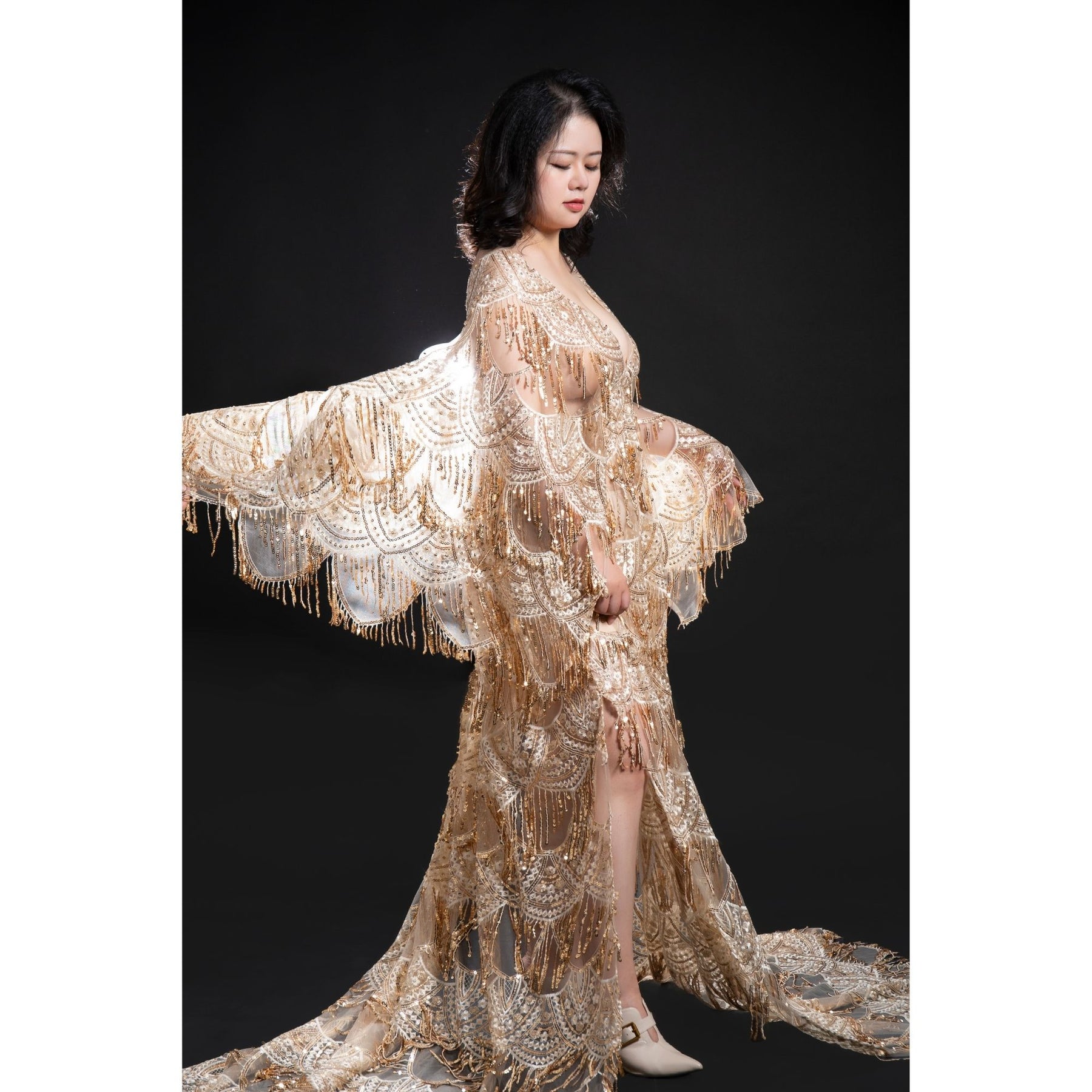 Product name: Sparkly Vintage Photo Shoot Free Size Boho Sequent Embroidery Maternity Gown Evening Party Dresses Pregnant Costume with Fringe for Photography Props