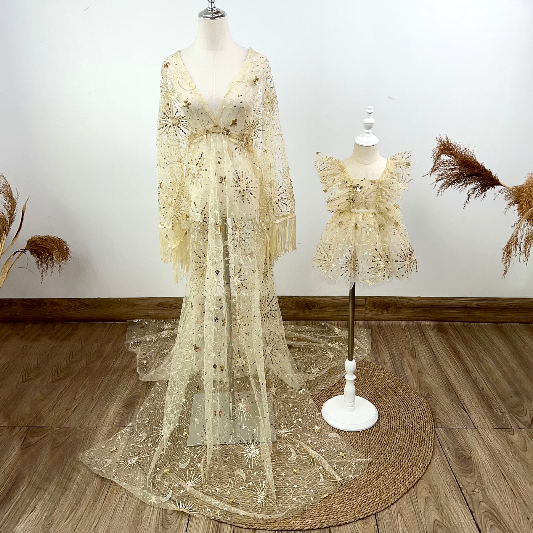 Sequence with Embroidery Moon and Star Mommy Gown with Matched Little Gilrs 9-24 Month and 3-6years Old Dress Set Boho Dress Pregnancy Photography Dresses Bohemia Maxi Gown Photo Shoot Prop