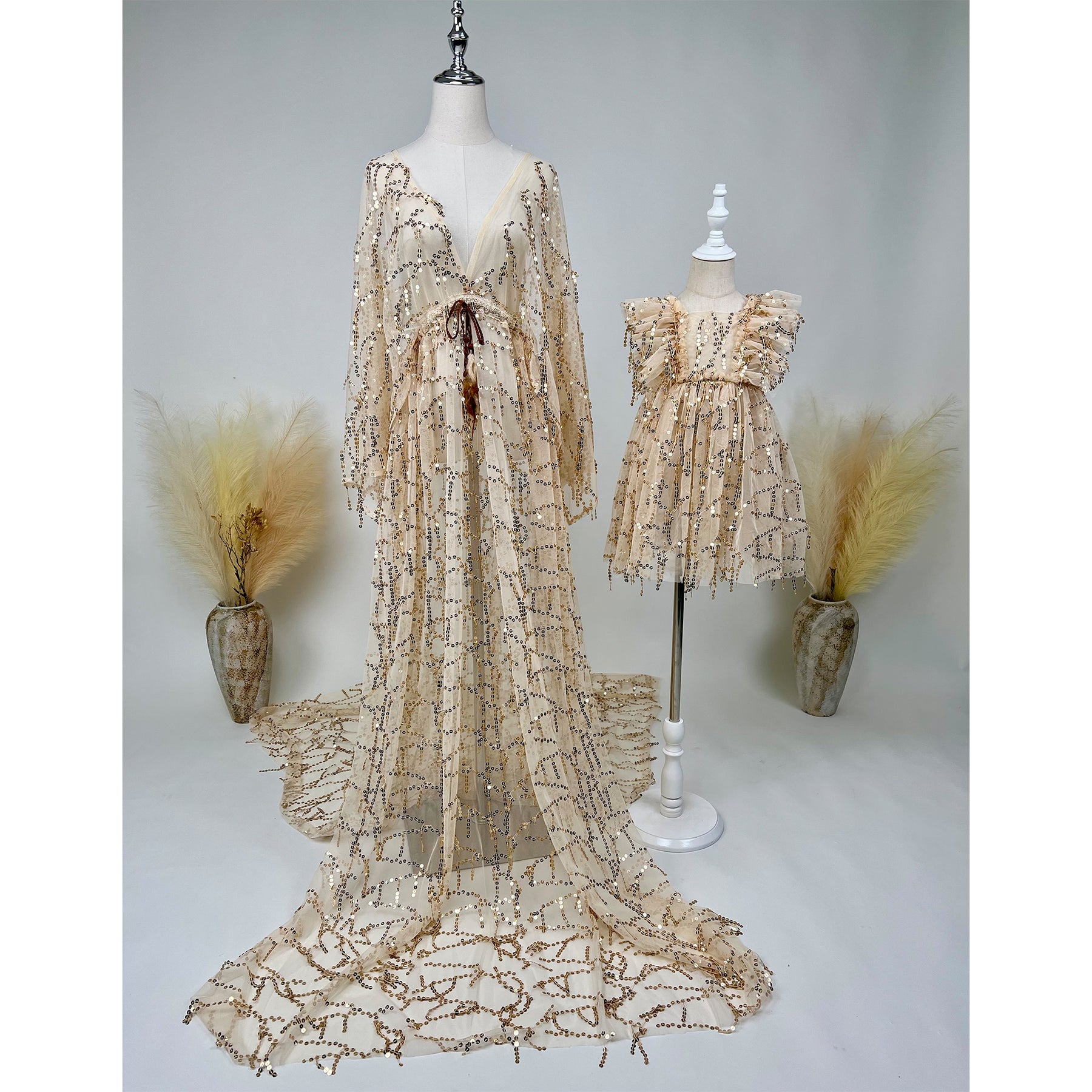Product name:  Sequence  Mommy Gown with Matched Little Gilrs 9-24 Month and 3-6years Old Dress Set Boho Dress Pregnancy Photography Dresses Bohemia Maxi Gown Photo Shoot Prop