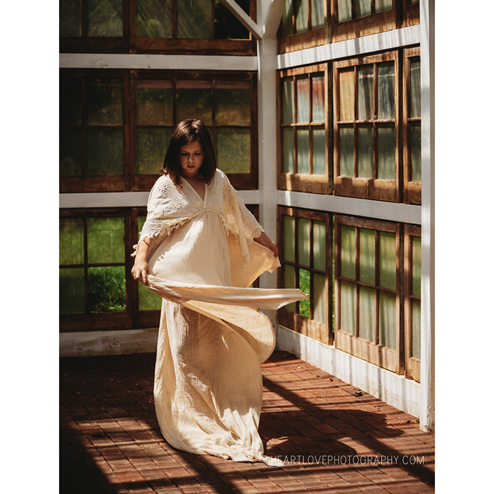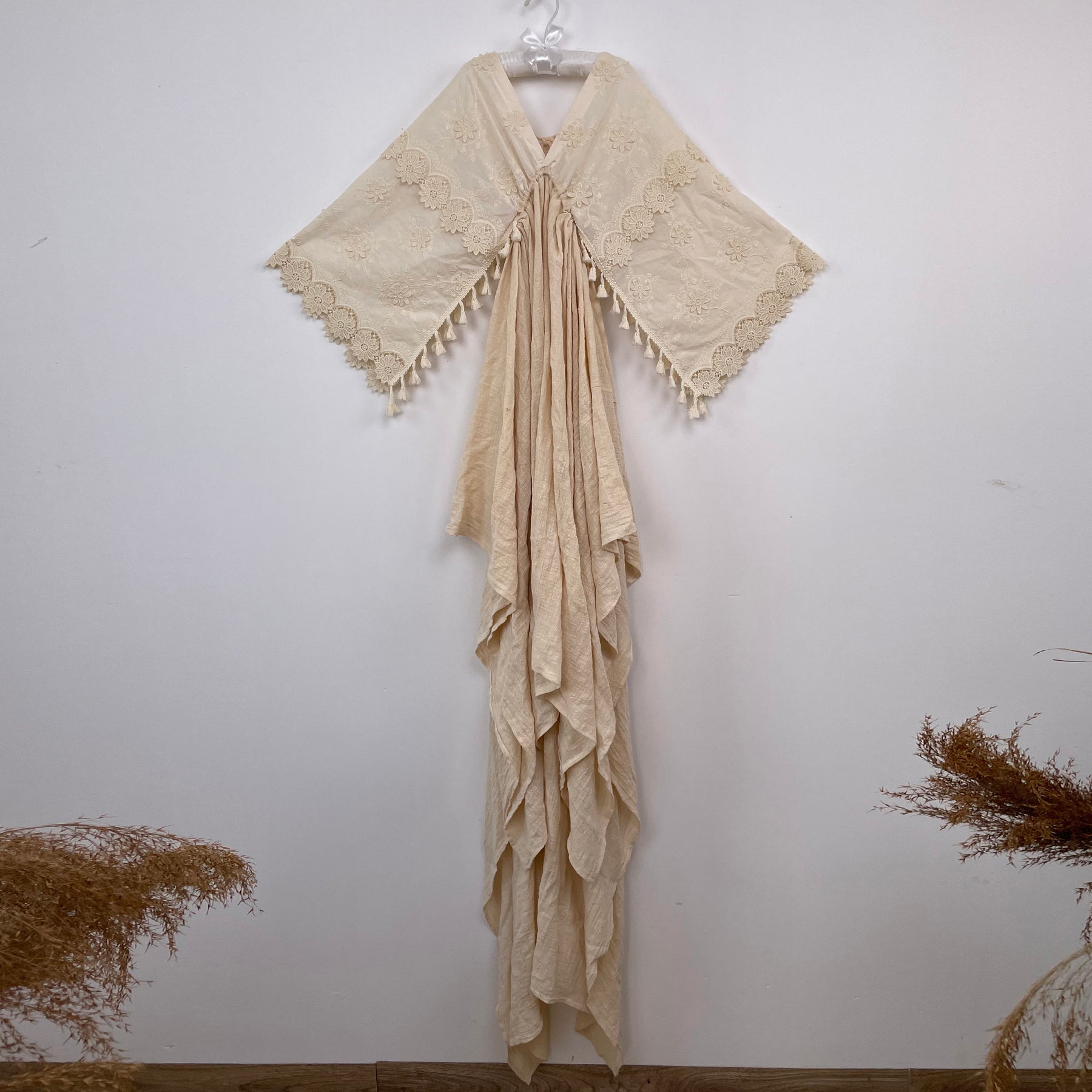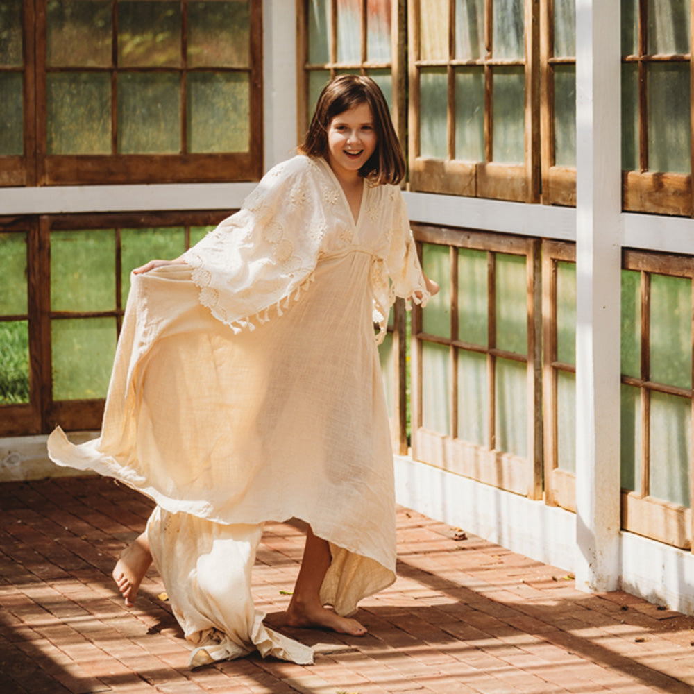 5-6 Years old  Kid Free Size Boho Photo Shoot New Soft Hand Floral Embroidery Cotton Long Bell Sleeves Little Girl Princess Casual Gown Evening Party Robe for Childen Photography Prop Studio